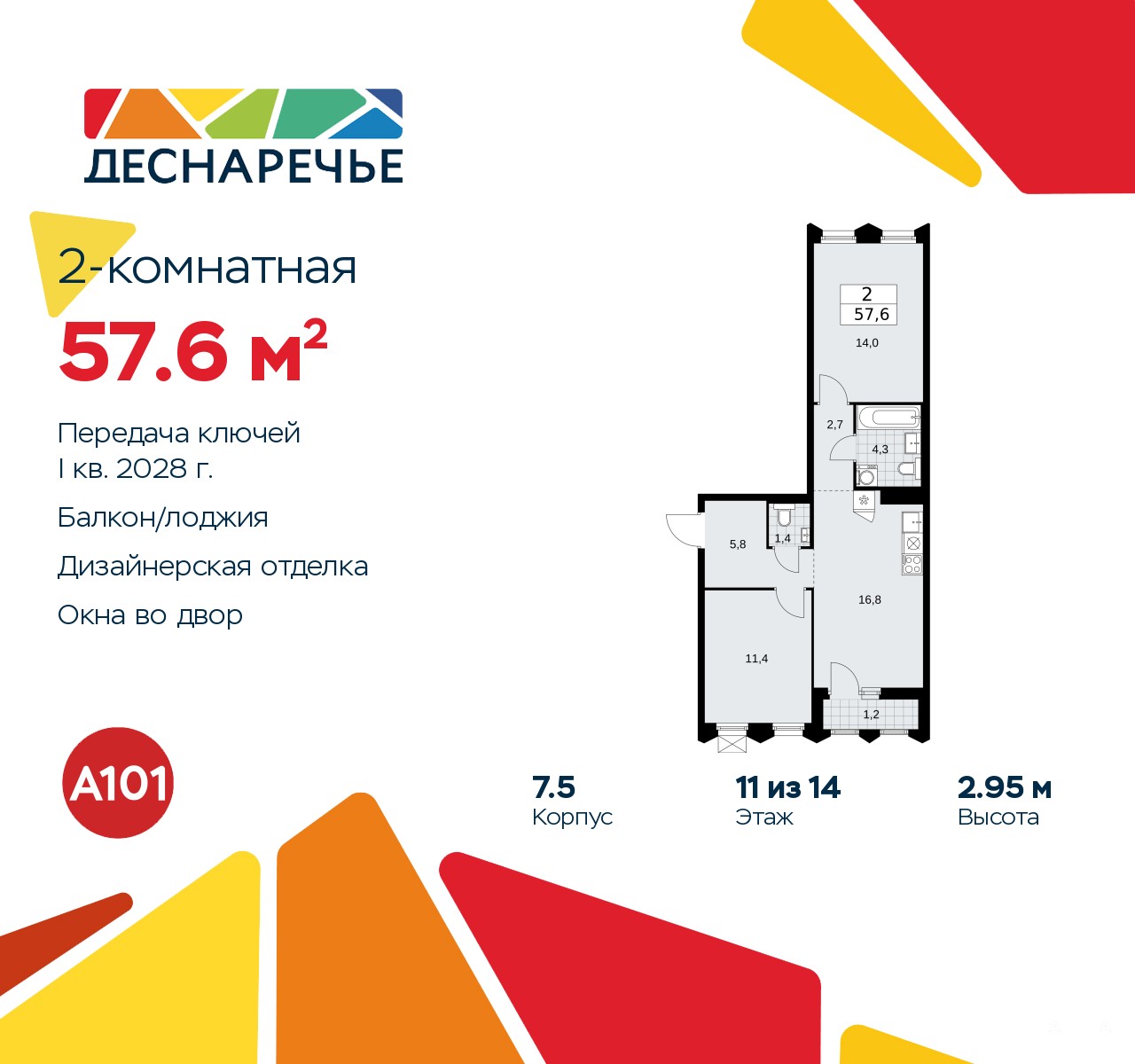 Продается 2-комн. квартира с отделкой в ЖК "Деснаречье" на 11 этаже. Общая площадь: 57.6 кв.м., жилая: 25.4 кв.м., площадь просторной кухни-столовой: 16.8 кв.м. Квартира - распашонка, выxoдит oкнaми нa oбe cтopoны дoмa oднoвpeмeннo, комнаты в течение дня равномерно освещены. В квартире одна лоджия, один совмещенный и один раздельный санузел. Высота потолков 2.95 м.