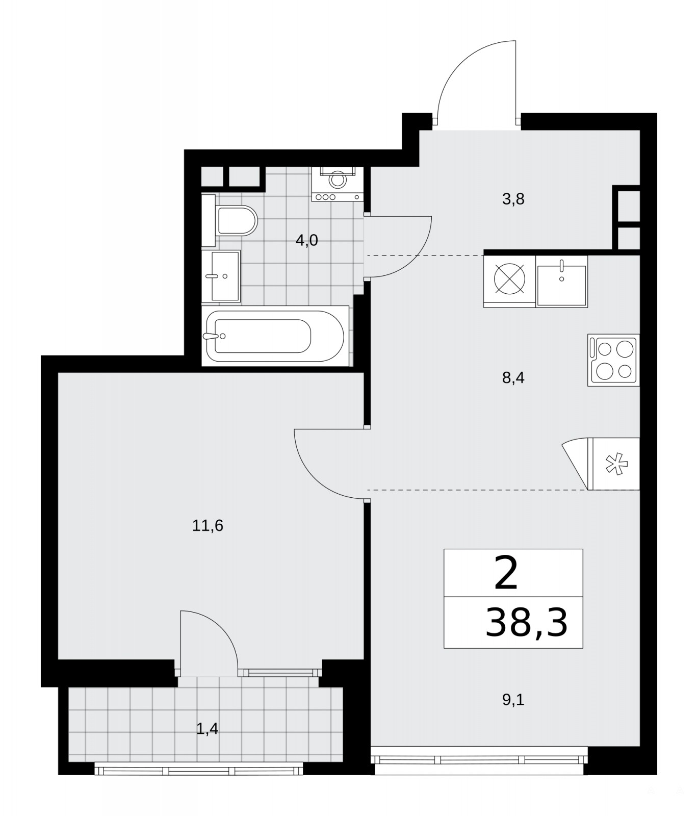2-комн. квартира с европланировкой и предчистовой отделкой в ЖК "Деснаречье" на 4 этаже. Общая площадь: 38.3 кв.м., жилая: 20.7 кв.м., суммарная площадь гостиной-столовой с кухонной зоной: 17.5 кв.м. Европейская планировка, кухня-гостиная - идеальный вариант для тех, кто любит часто принимать гостей. Комнаты изолированные, все окна выходят на одну сторону. В квартире одна лоджия, один совмещенный санузел. Высота потолков 2.99 м.