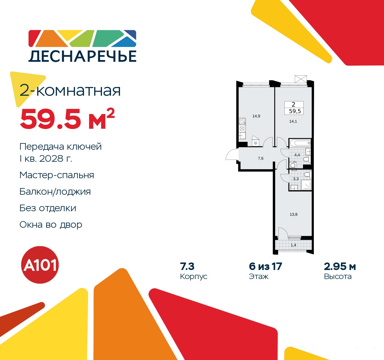 Просторная двухкомнатная квартира в ЖК "Деснаречье" на 6 этаже. Квартира без отделки, новый владелец может сделать ремонт по своему проекту. Общая площадь: 59.5 кв.м., жилая: 27.9 кв.м., площадь просторной кухни-столовой: 14.9 кв.м. Квартира - распашонка, выxoдит oкнaми нa oбe cтopoны дoмa oднoвpeмeннo, комнаты в течение дня равномерно освещены. В квартире одна лоджия, два совмещенных санузла. Высота потолков 2.95 м.