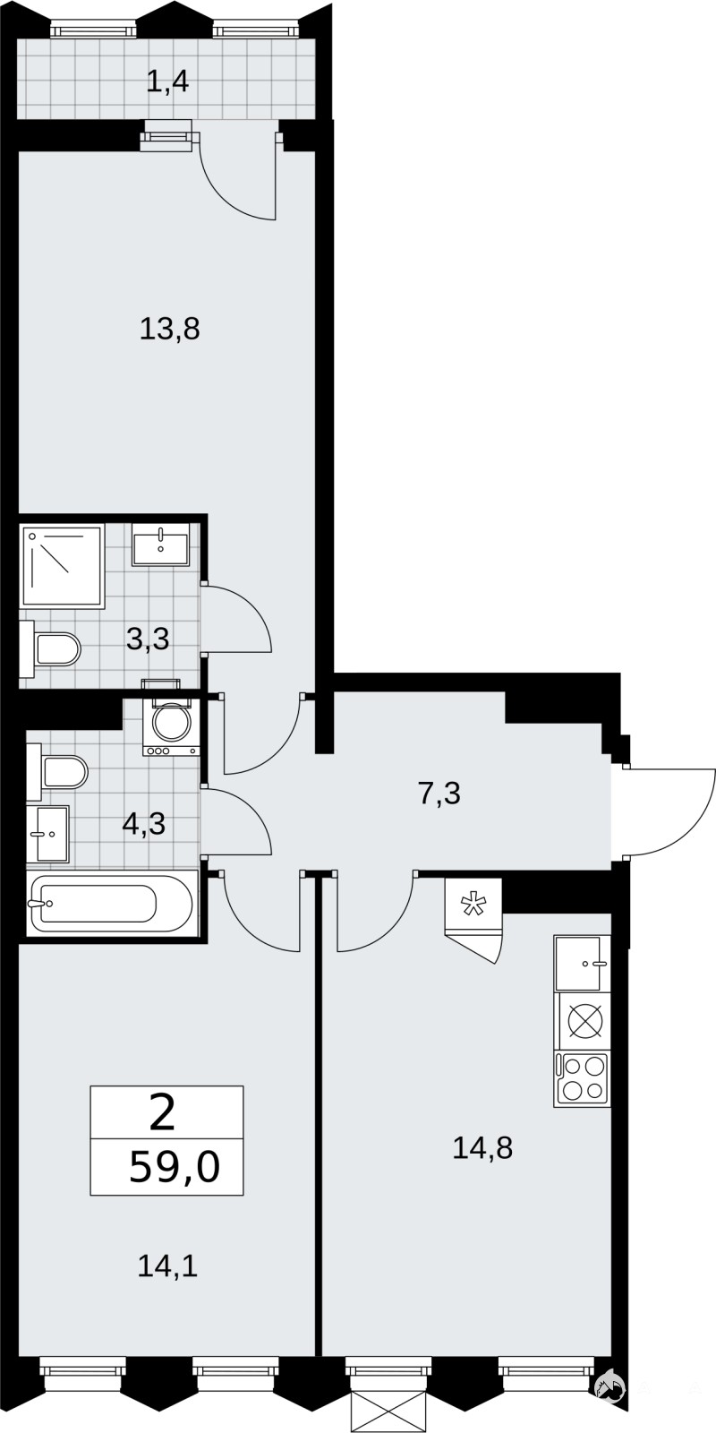 Просторная двухкомнатная квартира в ЖК "Деснаречье" на 11 этаже. Квартира без отделки, новый собственник может сделать ремонт по индивидуальному дизайн-проекту. Общая площадь: 59 кв.м., жилая: 27.9 кв.м., площадь просторной кухни-столовой: 14.8 кв.м. Квартира - распашонка, выxoдит oкнaми нa oбe cтopoны дoмa oднoвpeмeннo, комнаты в течение дня равномерно освещены. В квартире одна лоджия, два совмещенных санузла. Высота потолков 2.95 м.