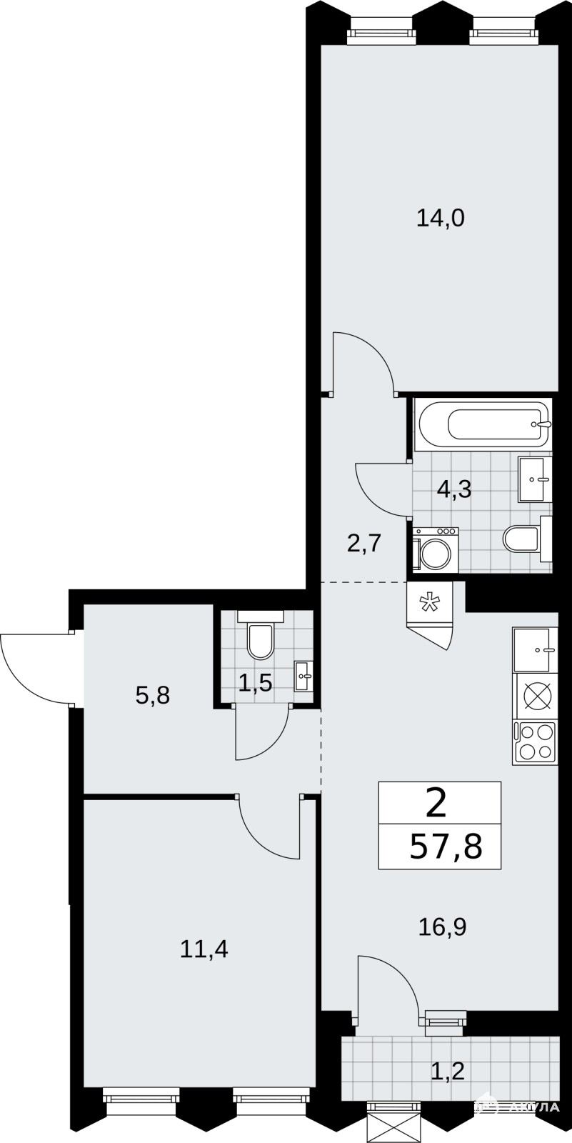 2-комн. квартира от застройщика в ЖК "Деснаречье" на 13 этаже. Квартира без отделки, после оформления собственности можно делать ремонт. Общая площадь: 57.8 кв.м., жилая: 25.4 кв.м., площадь просторной кухни-столовой: 16.9 кв.м. Квартира - распашонка, без проходных комнат, окна выходят на paзные стороны дома. В квартире одна лоджия, один совмещенный и один раздельный санузел. Высота потолков 2.95 м.