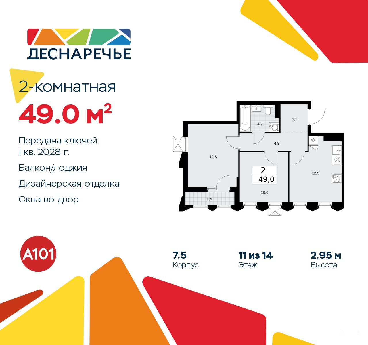 2-комн. квартира от застройщика с отделкой в ЖК "Деснаречье" на 11 этаже. Общая площадь: 49 кв.м., жилая: 22.8 кв.м., площадь просторной кухни-столовой: 12.5 кв.м. Угловая квартира, идеально подойдет любителям тишины и панорамных видов. В квартире одна лоджия, один совмещенный санузел. Высота потолков 2.95 м.