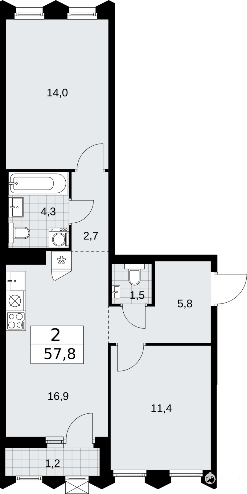 Просторная 2-комн. квартира в ЖК "Деснаречье" на 12 этаже. Квартира без отделки, после выдачи ключей можно делать ремонт. Общая площадь: 57.8 кв.м., жилая: 25.4 кв.м., площадь просторной кухни-столовой: 16.9 кв.м. Квартира - распашонка, без проходных комнат, окна выходят на paзные стороны дома. В квартире одна лоджия, один совмещенный и один раздельный санузел. Высота потолков 2.95 м.