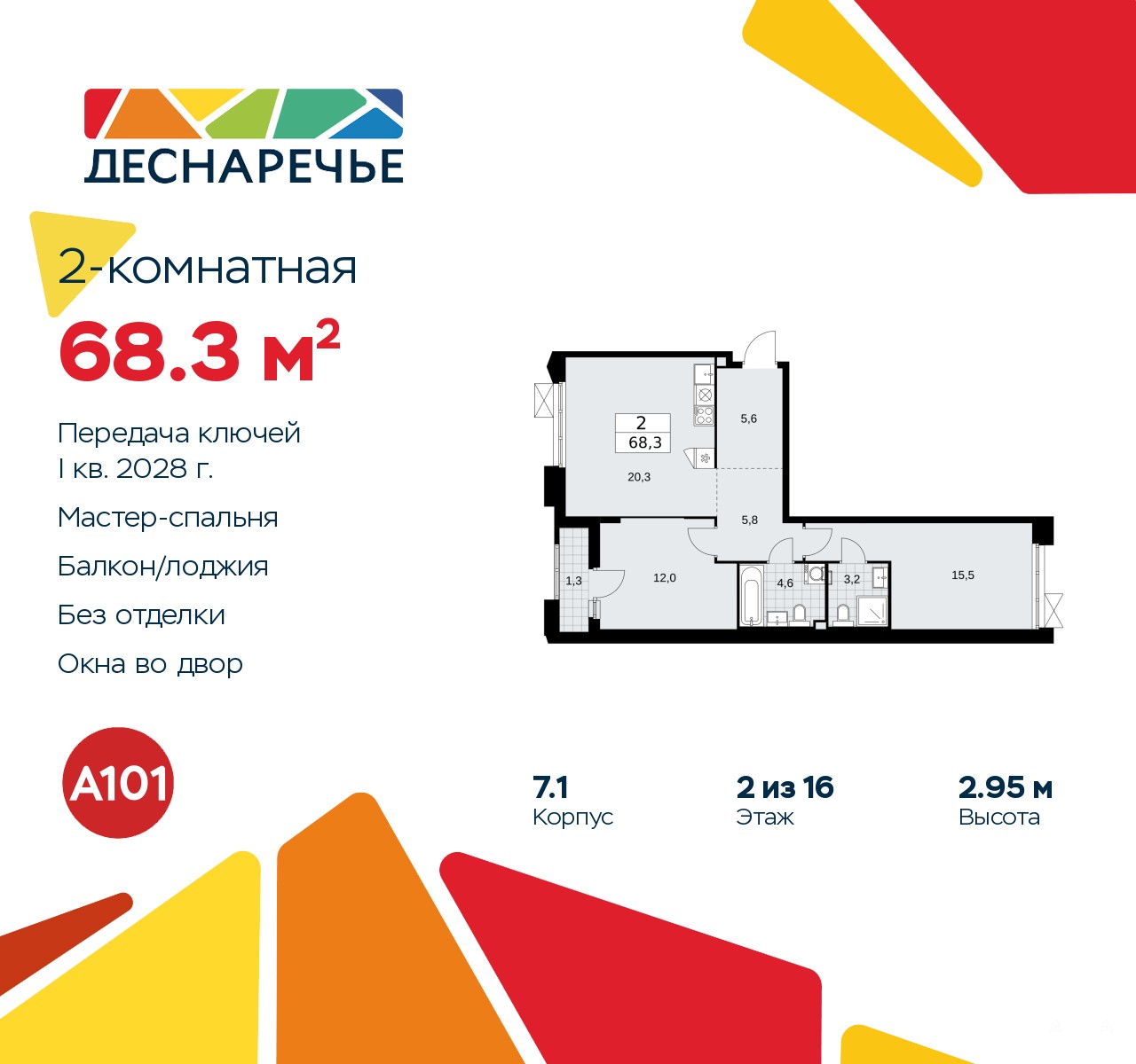 2-комн. квартира в ЖК "Деснаречье" на 2 этаже. Квартира без отделки, после оформления собственности можно делать ремонт. Общая площадь: 68.3 кв.м., жилая: 27.5 кв.м., площадь просторной кухни-столовой: 20.3 кв.м. Квартира - распашонка, без проходных комнат, окна выходят на paзные стороны дома. В квартире одна лоджия, два совмещенных санузла. Высота потолков 2.95 м.