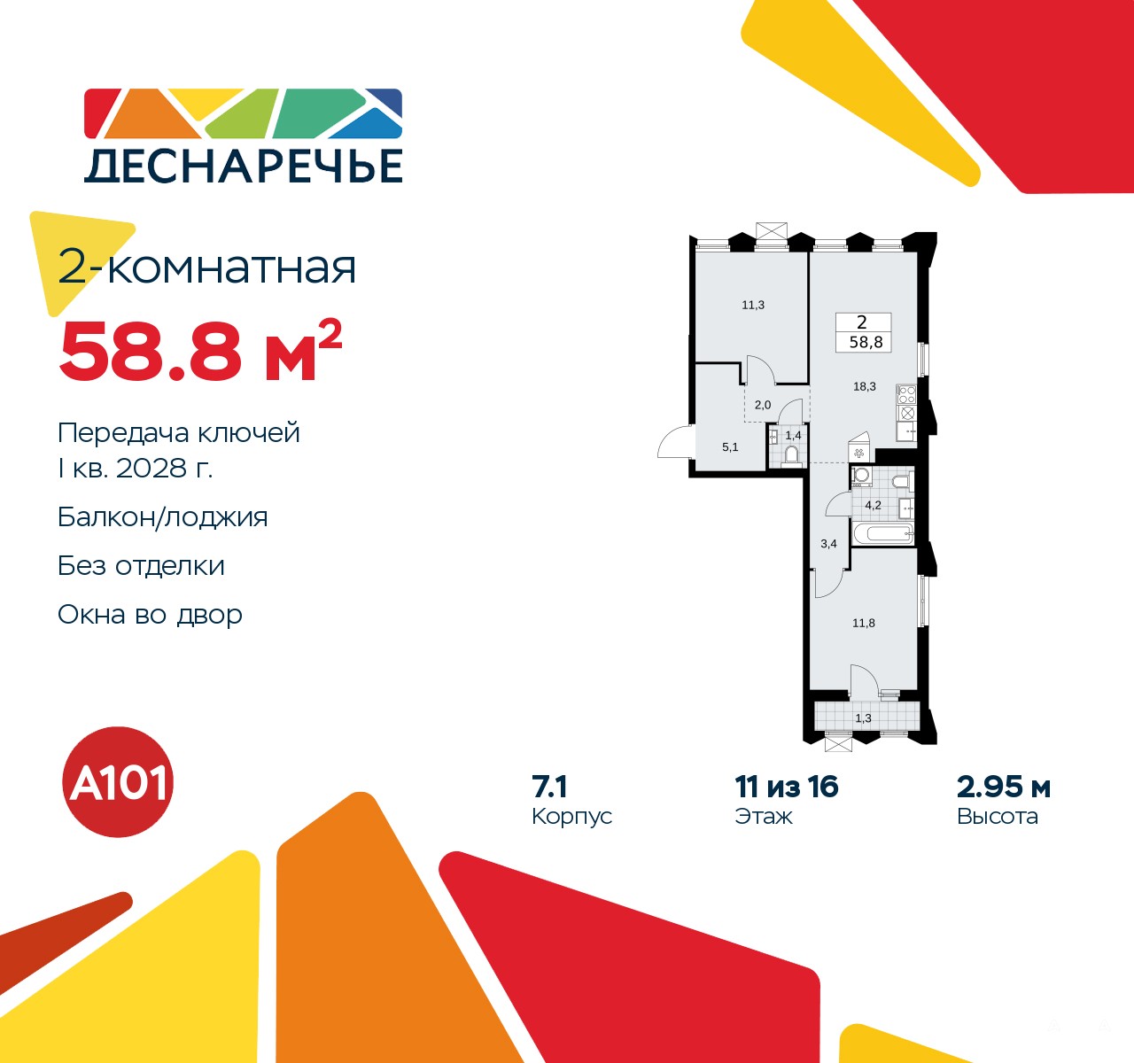 2-комн. квартира от застройщика в ЖК "Деснаречье" на 11 этаже. Квартира без отделки, полностью готова к ремонту. Общая площадь: 58.8 кв.м., жилая: 23.1 кв.м., площадь просторной кухни-столовой: 18.3 кв.м. Квартира без проходных комнат, окна выходят нa три cтopoны дома. В квартире одна лоджия, один совмещенный и один раздельный санузел. Высота потолков 2.95 м.