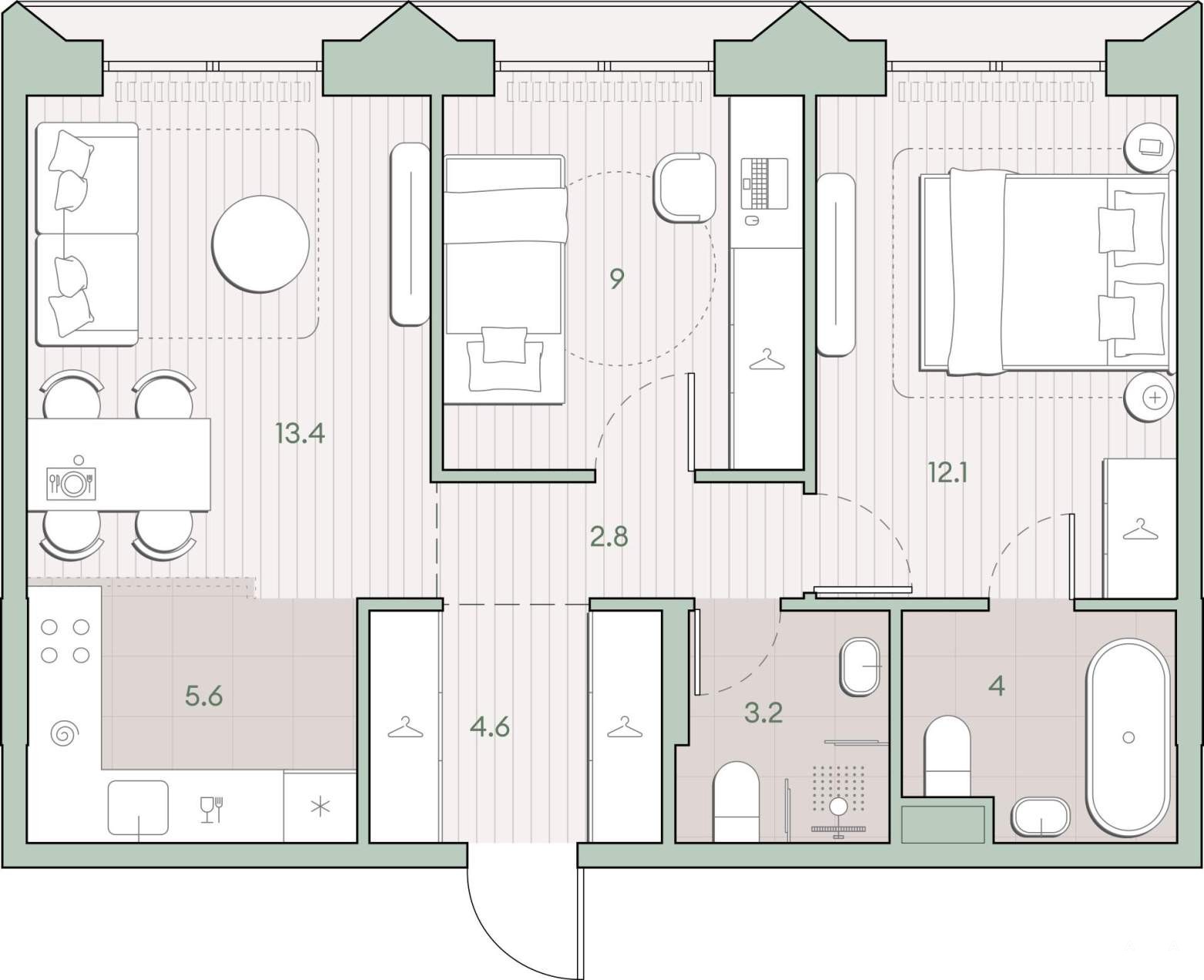 Жилая площадь 34.5 м2, квартира без отделки, комнаты изолированные.
