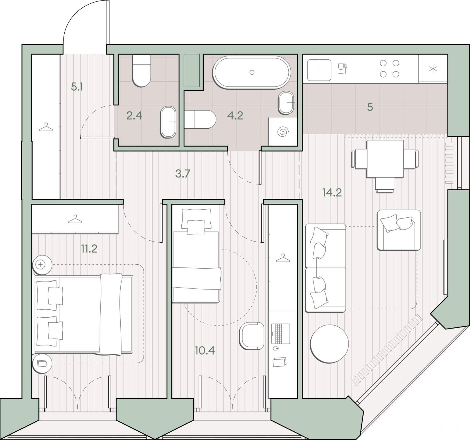 Жилая площадь 35.8 м2, кухня 5 м2, квартира без отделки, комнаты изолированные.