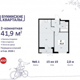2-комн. квартира с европланировкой от застройщика в ЖК "Бунинские кварталы" на 15 этаже. Квартира без отделки, после получения ключей можно делать ремонт. Общая площадь: 41.9 кв.м., жилая: 23.6 кв.м., общая площадь гостиной-столовой с кухонной зоной: 18.7 кв.м. Европланировка, кухня и...