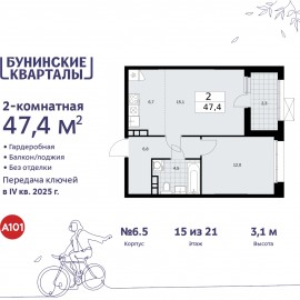 2-комн. квартира бизнес-класса с европланировкой в ЖК "Бунинские кварталы" на 15 этаже. Квартира без отделки, новый собственник может сделать ремонт по индивидуальному проекту. Общая площадь: 47.4 кв.м., жилая: 27.1 кв.м., суммарная площадь гостиной-столовой с кухонной зоной: 21.8...