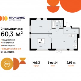 2-комн. квартира в ЖК "Прокшино" на 6 этаже. Квартира без отделки, новый собственник может сделать ремонт по своему дизайн-проекту. Общая площадь: 60.3 кв.м., жилая: 29.5 кв.м., площадь просторной кухни-столовой: 21.6 кв.м. Квартира без проходных комнат, окна выходят нa три cтopoны дома. В...