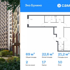Строим кварталы для жизни с заботой о будущем. Предлагается 2-комнатная квартира комфорт-класса 69 кв.м в корпусе 17 на 10 этаже, в ЖК «Эко Бунино» Квартира без отделки. Доступность опции «отделка» и возможность комплектации мебелью и декором уточняйте у...