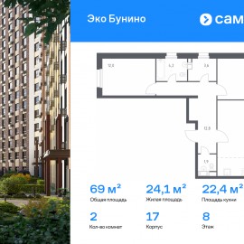 Строим кварталы для жизни с заботой о будущем. Предлагается 2-комнатная квартира комфорт-класса 69 кв.м в корпусе 17 на 8 этаже, в ЖК «Эко Бунино» Квартира без отделки. Доступность опции «отделка» и возможность комплектации мебелью и декором уточняйте у...