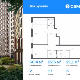 Строим кварталы для жизни с заботой о будущем. Предлагается 2-комнатная квартира комфорт-класса 68, 8 кв.м в корпусе 18-19 на 16 этаже, в ЖК «Эко Бунино» Квартира без отделки. Доступность опции «отделка» и возможность комплектации мебелью и декором уточняйте у...