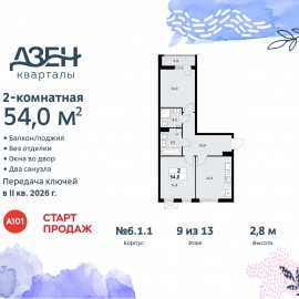 Просторная 2-комн. квартира в ЖК "Дзен-кварталы" на 9 этаже. Квартира без отделки, полностью готова к ремонту. Общая площадь: 54 кв.м., жилая: 22.8 кв.м., площадь просторной кухни-столовой: 12.1 кв.м. Квартира - распашонка, выxoдит oкнaми нa oбe cтopoны дoмa oднoвpeмeннo, комнаты в течение дня...