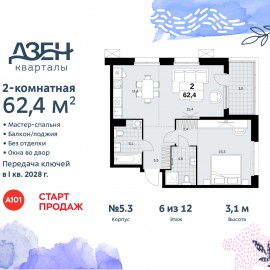 2-комн. квартира бизнес-класса с европланировкой от застройщика в ЖК "Дзен-кварталы" на 6 этаже. Квартира без отделки, новый владелец может сделать ремонт по своему дизайн-проекту. Общая площадь: 62.4 кв.м., жилая: 30.8 кв.м., общая площадь гостиной-столовой с кухонной зоной: 26.7 кв.м....