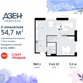 2-комн. квартира бизнес-класса с европланировкой и отделкой в ЖК "Дзен-кварталы" на 2 этаже. Общая площадь: 54.7 кв.м., жилая: 31.8 кв.м., суммарная площадь гостиной-столовой с кухонной зоной: 27.4 кв.м. Европейская планировка, кухня-гостиная - идеальный вариант для тех, кто любит часто...