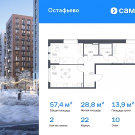 Строим кварталы для жизни с заботой о будущем. Предлагается 2-комнатная квартира комфорт-класса 57, 4 кв.м в корпусе 22 на 10 этаже, в ЖК «Остафьево» Квартира с чистовой отделкой. Доступность дополнительных опций уточняйте у застройщика. Приобрести квартиру возможно по...
