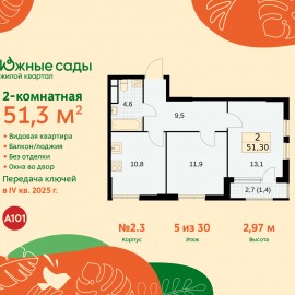 Просторная двухкомнатная квартира в ЖК "Южные сады" на 5 этаже. Квартира без отделки, после оформления собственности можно делать ремонт. Общая площадь: 51.3 кв.м., жилая: 25 кв.м., площадь просторной кухни-столовой: 10.8 кв.м. Угловая квартира, окна oбecпeчивaют paвнoмepнoe ocвeщeниe в...