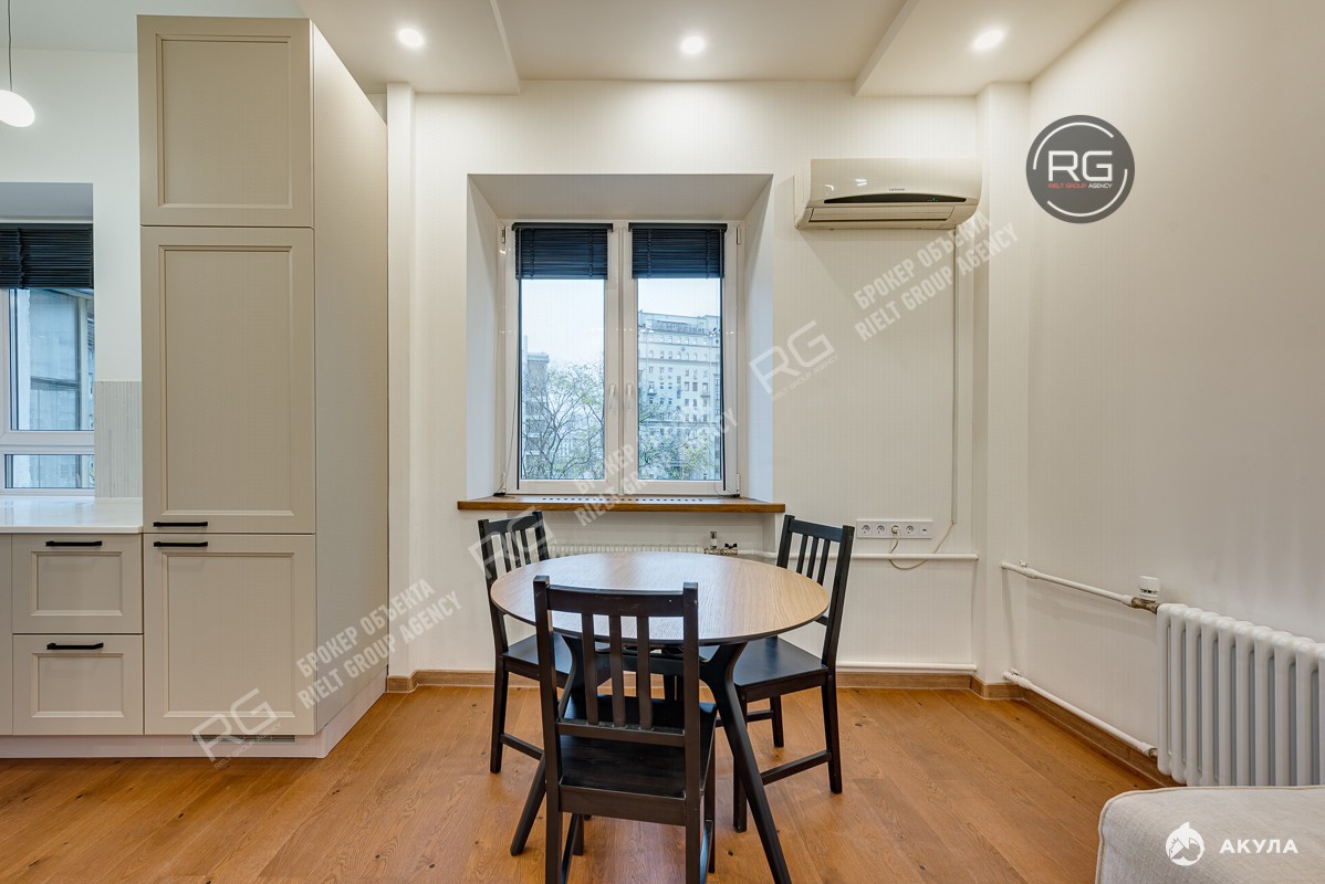 Квартира очень светлая, и имеет четыре больших окна вид из которых открывается в зеленый двор, на посольство Великобритании и Москва-Сити, а также на Панфиловский переулок.