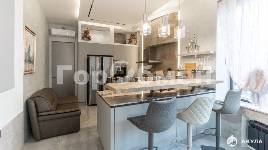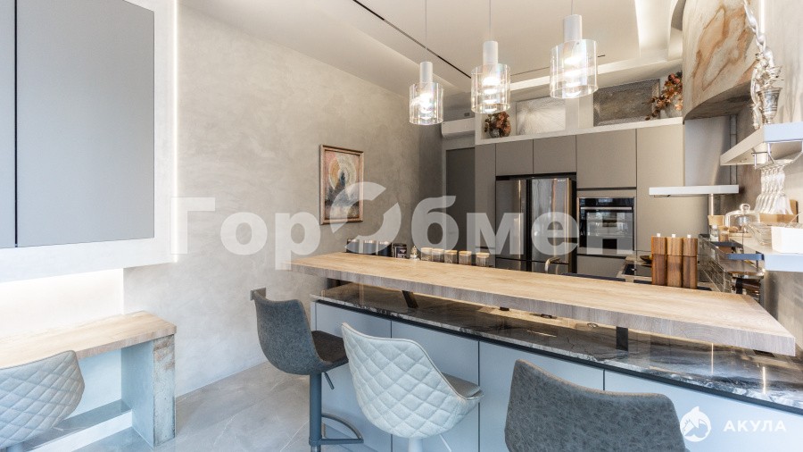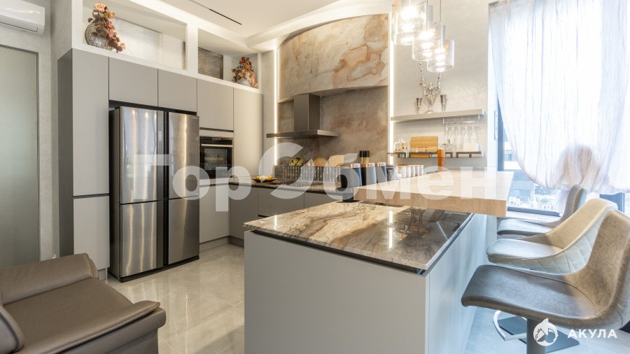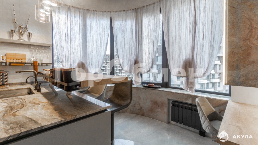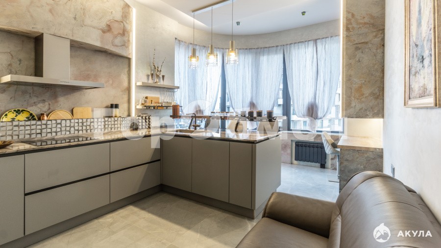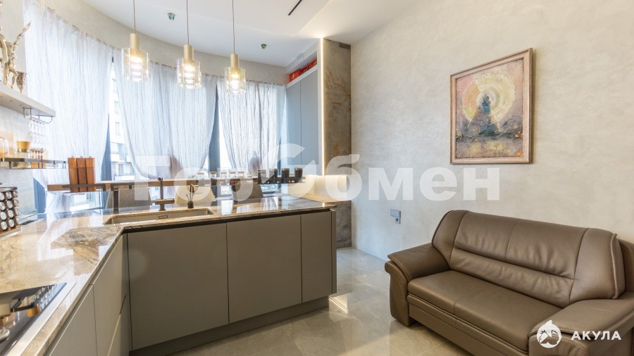 Гостиная: Кухня Häcker (Германия) Премиальная Бытовая техника Neff (Германия): Посудомоечная машина; Индукционная варочная плита; Комбинированный духовой шкаф-пароварка с функцией Су Вид; Вытяжка Falmec Plane Top (Италия) Система мгновенного кипячения InSinkErator AquaHot (США) Измельчитель InSinkErator Evolution ( США) Двухкамерный холодильник SHARP (Япония) Кухонная столешница и подоконники - мрамор Арабескато (Италия), Отделка гостиной, спальни и балкона - натуральным каменным шпоном, декоративная покраска GIOLLI