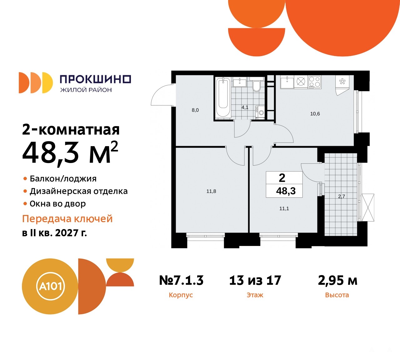 Просторная двухкомнатная квартира с отделкой в ЖК "Прокшино" на 13 этаже. Общая площадь: 48.3 кв.м., жилая: 22.9 кв.м., площадь просторной кухни-столовой: 10.6 кв.м. Квартира угловая, окна oбecпeчивaют paвнoмepнoe ocвeщeниe в тeчeниe дня. В квартире одна лоджия, один совмещенный санузел. Высота потолков 2.95 м.