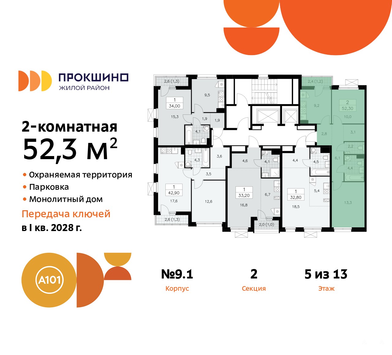 Дом монолитный, двухподъездный, высотой 13 этажей. Квартира находится во 2-й секции в корпусе 9.1. На этаже 5 квартир. В подъезде 1 пассажирский и 1 грузовой лифт. Начало строительства - 3 квартал 2025 года. Окончание строительства - 4 квартал 2027 года. Оформление сделки по договору долевого участия.