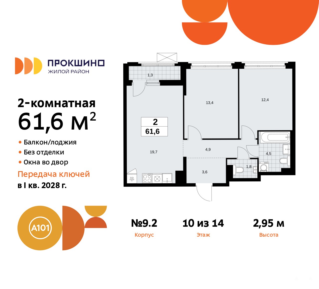 Двухкомнатная квартира в ЖК "Прокшино" на 10 этаже. Квартира без отделки, после получения ключей можно делать ремонт. Общая площадь: 61.6 кв.м., жилая: 25.8 кв.м., площадь просторной кухни-столовой: 19.7 кв.м. Комнаты изолированные, все окна выходят на одну сторону. В квартире одна лоджия, один совмещенный и один раздельный санузел. Высота потолков 2.95 м.