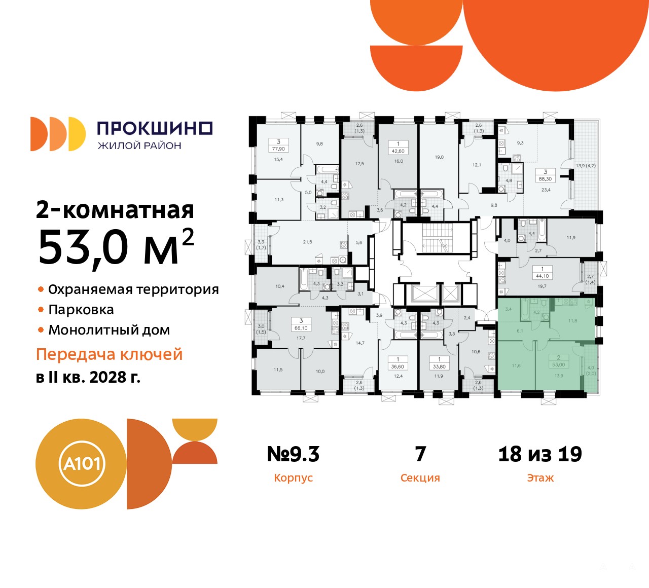 Квартира находится в корпусе 9.3. Дом монолитный, одноподъездный, высотой 19 этажей. На этаже 9 квартир. В подъезде 1 пассажирский и 1 грузовой лифт. Начало строительства - 3 квартал 2025 года. Окончание строительства - 4 квартал 2027 года. Оформление сделки по договору долевого участия.