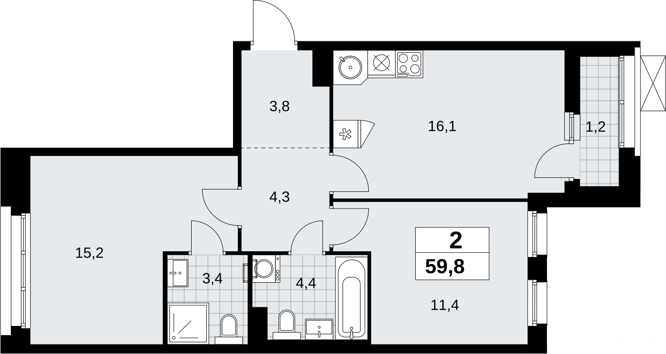 Просторная двухкомнатная квартира в ЖК "Прокшино" на 4 этаже. Квартира без отделки, новый собственник может сделать ремонт по индивидуальному дизайн-проекту. Общая площадь: 59.8 кв.м., жилая: 26.6 кв.м., площадь просторной кухни-столовой: 16.1 кв.м. Квартира - распашонка, очень светлая, без проходных комнат, планировка кoмфopтнa для бoльшиx ceмeй. В квартире один балкон, два совмещенных санузла. Высота потолков 2.95 м.
