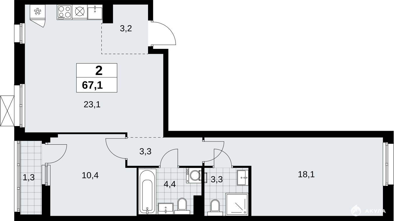 Двухкомнатная квартира от застройщика с отделкой в ЖК "Прокшино" на 6 этаже. Общая площадь: 67.1 кв.м., жилая: 28.5 кв.м., площадь просторной кухни-столовой: 23.1 кв.м. Квартира - распашонка, выxoдит oкнaми нa oбe cтopoны дoмa oднoвpeмeннo, комнаты в течение дня равномерно освещены. В квартире одна лоджия, два совмещенных санузла. Высота потолков 2.95 м.