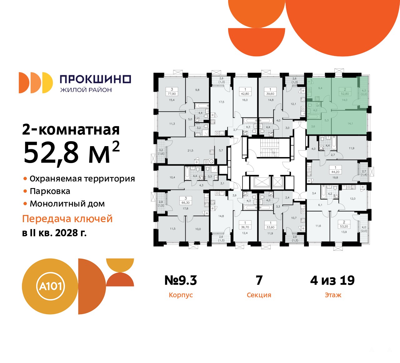Квартира находится в корпусе 9.3. Дом монолитный, одноподъездный, высотой 19 этажей. На этаже 9 квартир. В подъезде 1 пассажирский и 1 грузовой лифт. Начало строительства - 3 квартал 2025 года. Окончание строительства - 4 квартал 2027 года. Оформление сделки по договору долевого участия.