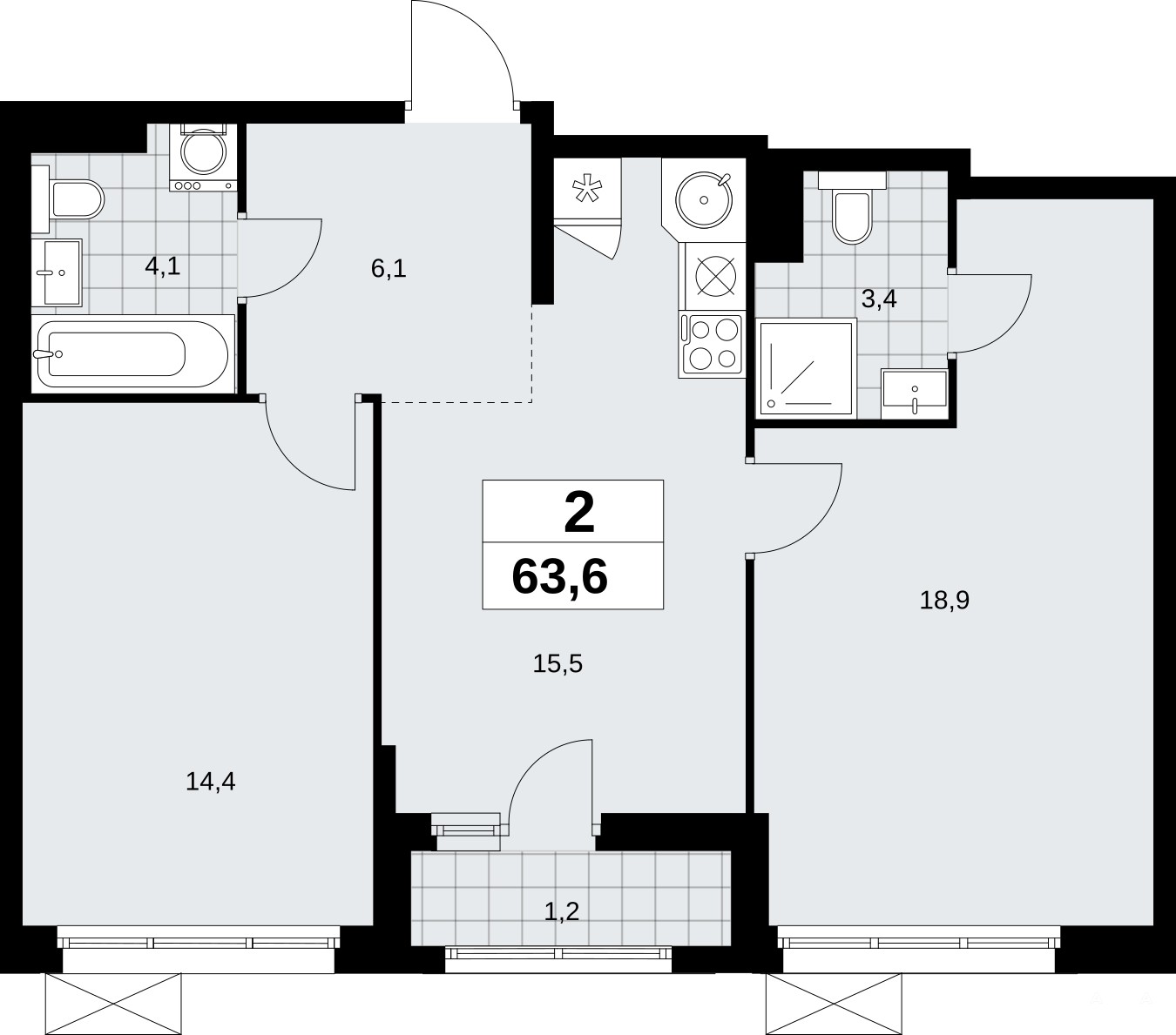 Двухкомнатная квартира от застройщика в ЖК "Прокшино" на 10 этаже. Квартира без отделки, полностью готова к ремонту. Общая площадь: 63.6 кв.м., жилая: 33.3 кв.м., площадь просторной кухни-столовой: 15.5 кв.м. Комнаты изолированные, все окна выходят на одну сторону. В квартире одна лоджия, два совмещенных санузла. Высота потолков 2.95 м.