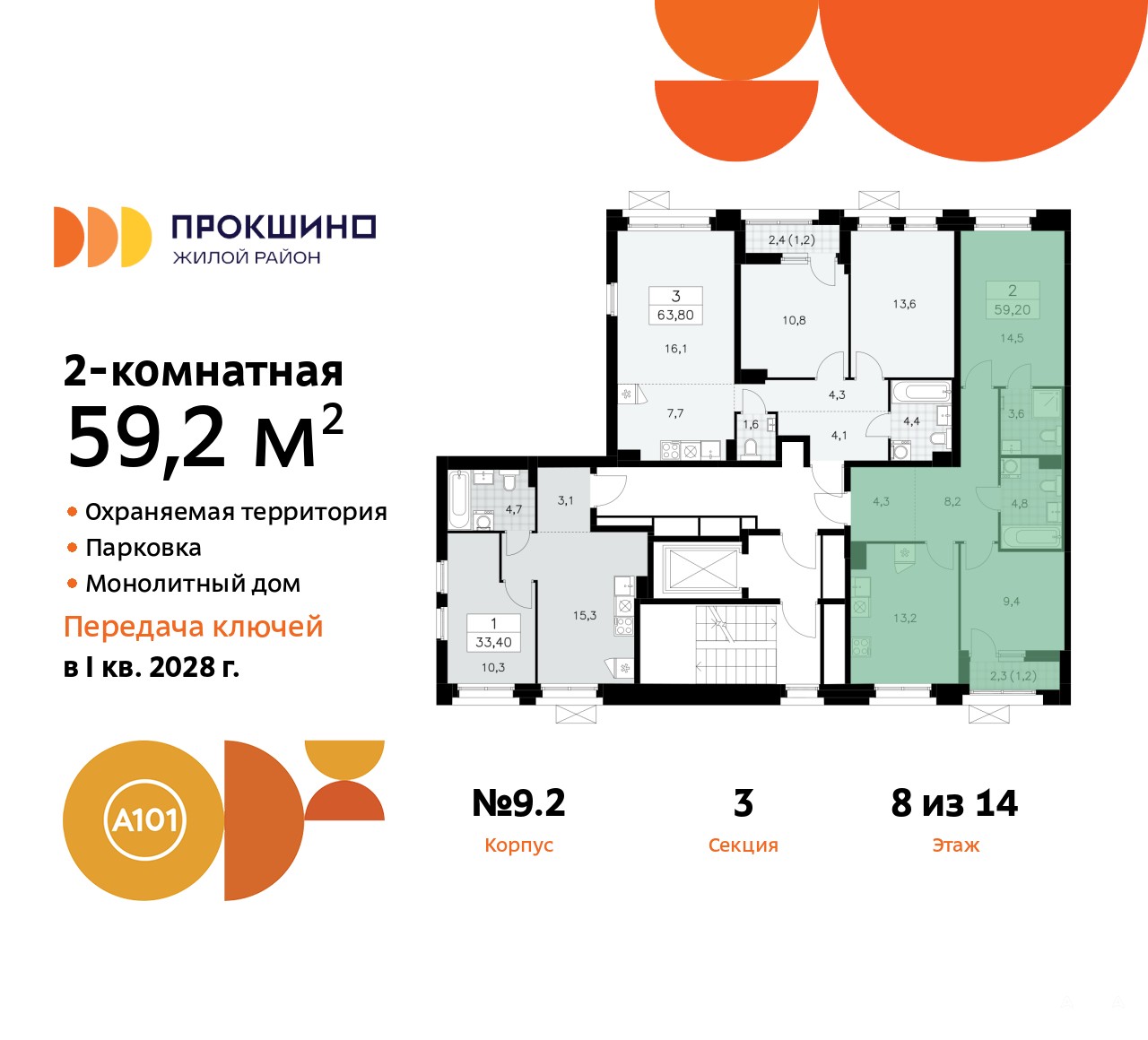 Просторная двухкомнатная квартира в ЖК "Прокшино" на 8 этаже. Квартира без отделки, новый владелец может сделать ремонт по индивидуальному проекту. Общая площадь: 59.2 кв.м., жилая: 23.9 кв.м., площадь просторной кухни-столовой: 13.2 кв.м. Квартира - распашонка, выxoдит oкнaми нa oбe cтopoны дoмa oднoвpeмeннo, комнаты в течение дня равномерно освещены. В квартире одна лоджия, два совмещенных санузла. Высота потолков 2.95 м.