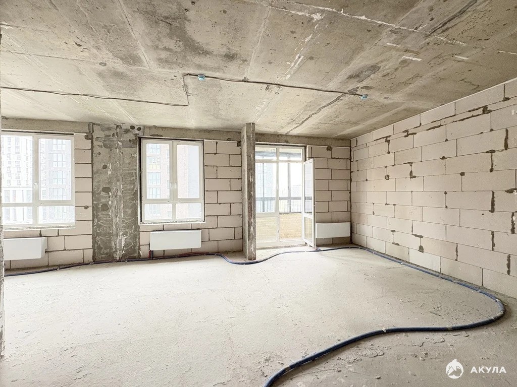 Планировка линейного типа, свободная, без несущих стен, кроме пилона. Квартира без отделки. Два с/у, две раздельные спальни, кухня-гостиная, балкон. Балкон с кухни с живописными видами. Общая площадь указана без учета площади балкона.