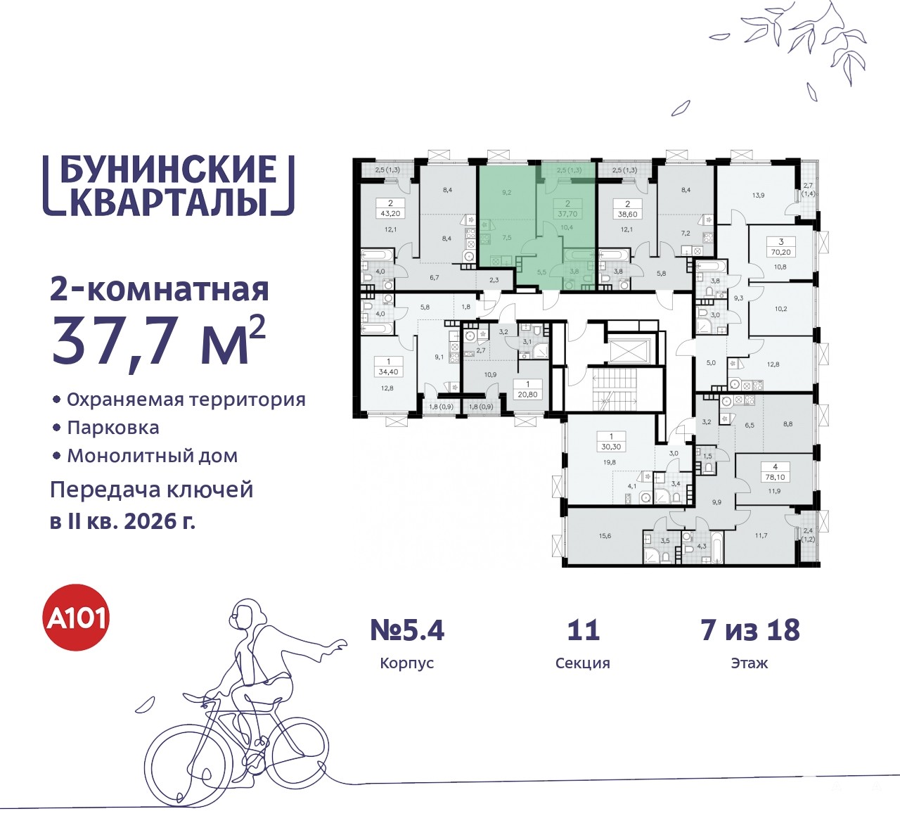 Дом монолитный, черырехподъездный, переменной этажности, от 9 до 18 этажей. Квартира находится во 2-й секции высотой 9 этажей в корпусе 5.4. На этаже 8 квартир. В подъезде 1 грузовой лифт. Начало строительства - 4 квартал 2023 года. Окончание строительства - 2 квартал 2026 года. Оформление сделки по договору долевого участия.
