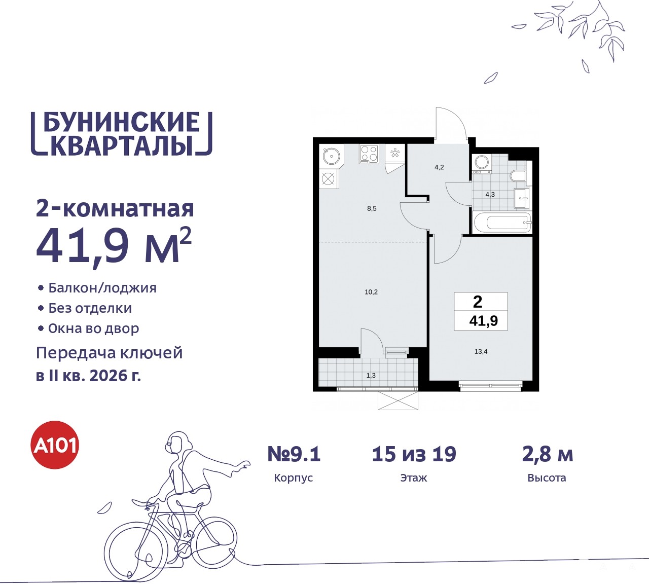 2-комн. квартира с европланировкой от застройщика в ЖК "Бунинские кварталы" на 15 этаже. Квартира без отделки, после получения ключей можно делать ремонт. Общая площадь: 41.9 кв.м., жилая: 23.6 кв.м., общая площадь гостиной-столовой с кухонной зоной: 18.7 кв.м. Европланировка, кухня и гостиная объединены в одно просторное помещение. Комнаты изолированные, все окна выходят на одну сторону. В квартире одна лоджия, один совмещенный санузел. Высота потолков 2.8 м.