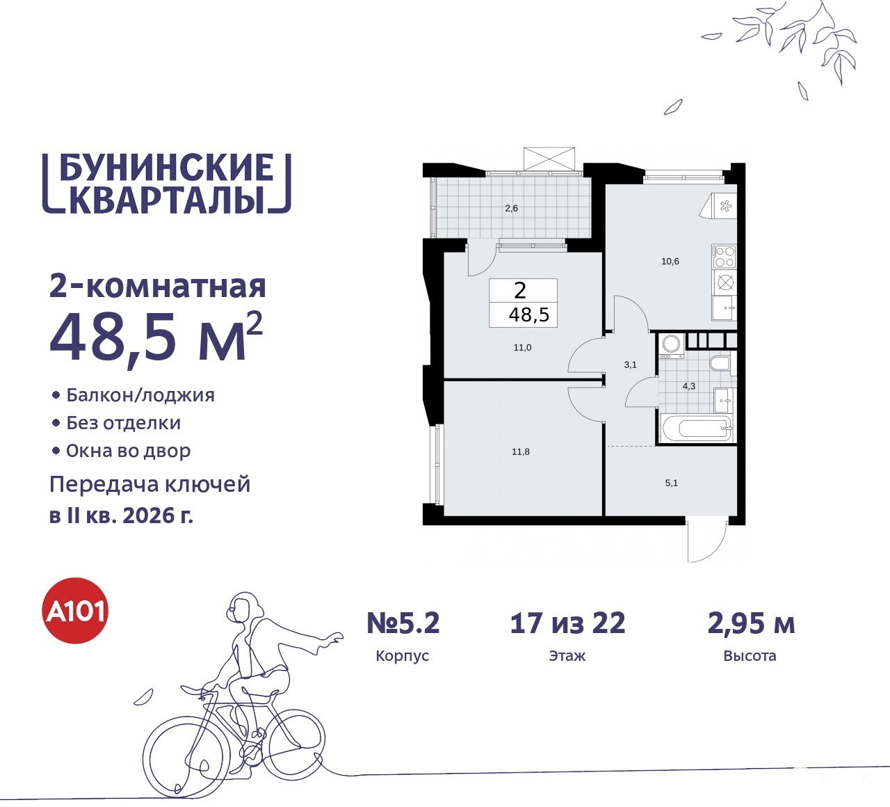 Продается 2-комн. квартира в ЖК "Бунинские кварталы" на 17 этаже. Квартира без отделки, после оформления собственности можно делать ремонт. Общая площадь: 48.5 кв.м., жилая: 22.8 кв.м., площадь просторной кухни-столовой: 10.6 кв.м. Квартира угловая, идеально подойдет любителям тишины и панорамных видов. В квартире одна лоджия, один совмещенный санузел. Высота потолков 2.95 м.