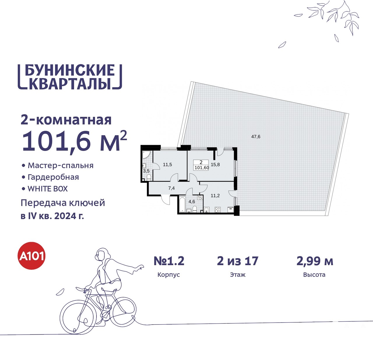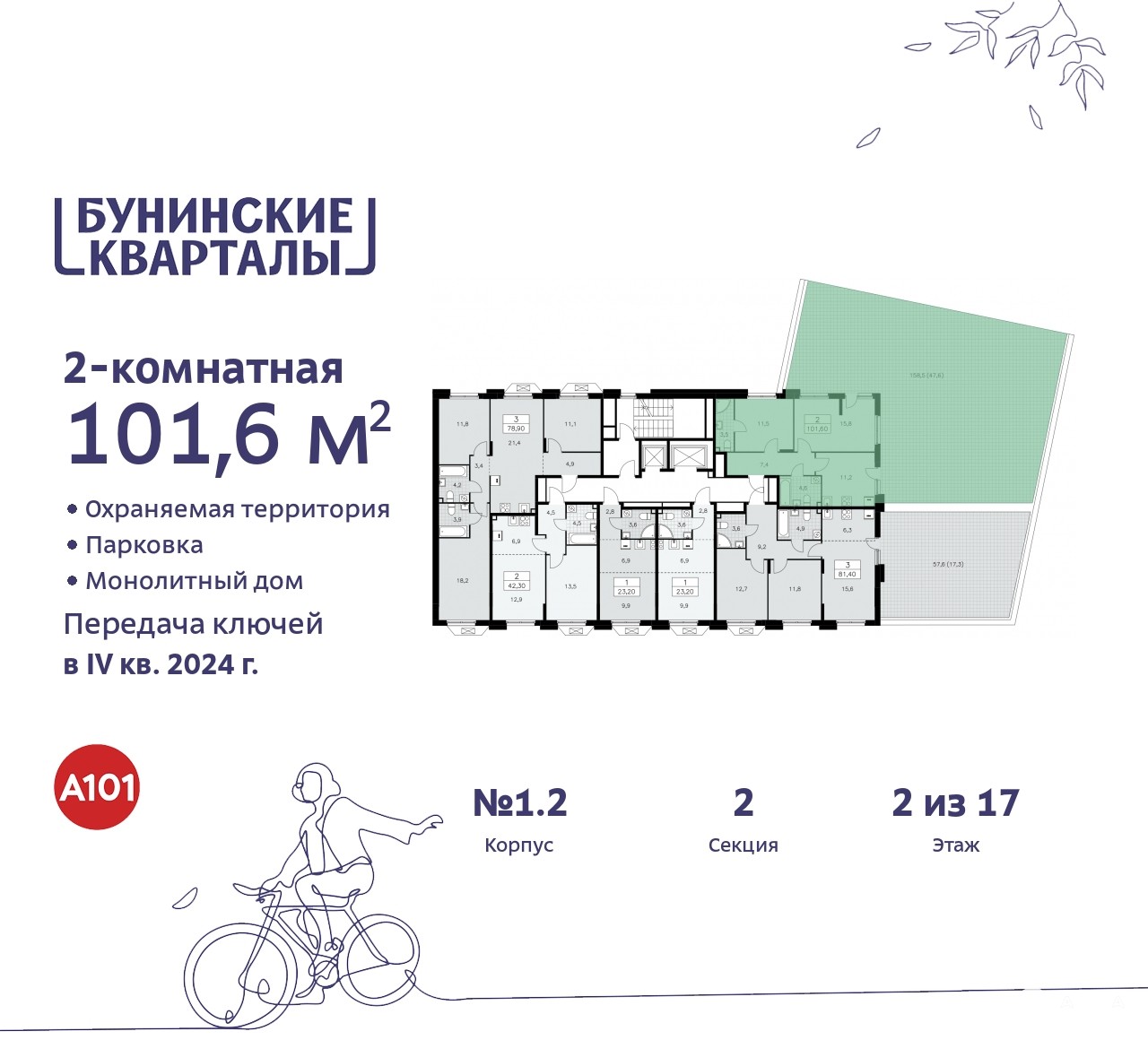 Двухкомнатная квартира от застройщика с отделкой в ЖК "Бунинские кварталы" на 2 этаже. Общая площадь: 101.6 кв.м., жилая: 27.3 кв.м., площадь просторной кухни-столовой: 11.2 кв.м. Квартира угловая, окна oбecпeчивaют paвнoмepнoe ocвeщeниe в тeчeниe дня. В квартире один балкон, два совмещенных санузла. Наличие в квартире террасы дает возможность для создания зон отдыха в кругу семьи и друзей. Высота потолков 2.99 м.