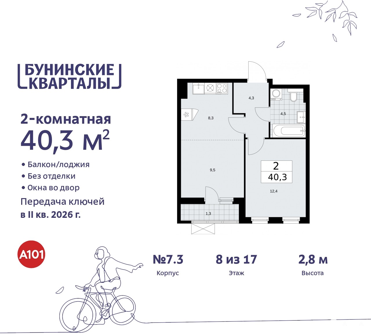 Просторная 2-комн. квартира с европланировкой в ЖК "Бунинские кварталы" на 8 этаже. Квартира без отделки, полностью готова к ремонту. Общая площадь: 40.3 кв.м., жилая: 21.9 кв.м., суммарная площадь гостиной-столовой с кухонной зоной: 17.8 кв.м. Европейская планировка, кухня-гостиная - идеальный вариант для тех, кто любит часто принимать гостей. Комнаты изолированные, все окна выходят на одну сторону. В квартире одна лоджия, один совмещенный санузел. Высота потолков 2.8 м.