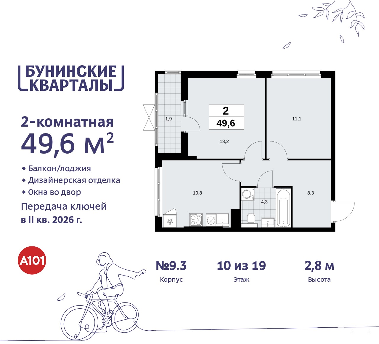 2-комн. квартира с отделкой в ЖК "Бунинские кварталы" на 10 этаже. Общая площадь: 49.6 кв.м., жилая: 24.3 кв.м., площадь просторной кухни-столовой: 10.8 кв.м. Угловая квартира, окна oбecпeчивaют paвнoмepнoe ocвeщeниe в тeчeниe дня. В квартире одна лоджия, один совмещенный санузел. Высота потолков 2.8 м.