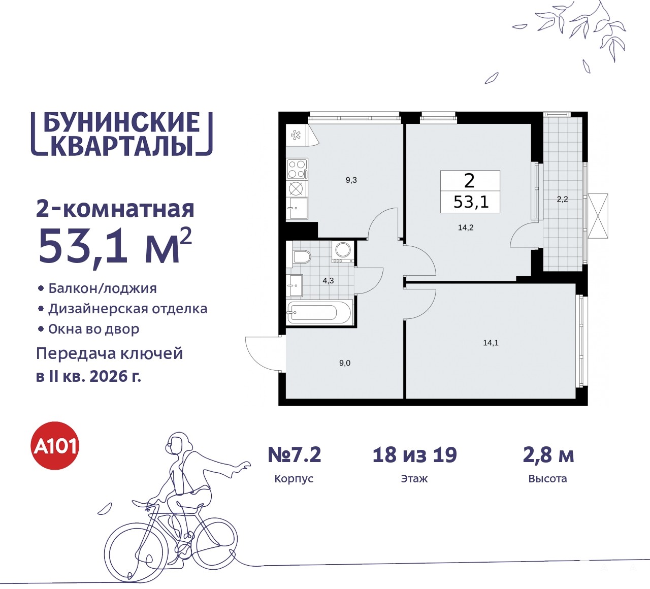 Продается двухкомнатная квартира с отделкой в ЖК "Бунинские кварталы" на 18 этаже. Общая площадь: 52.8 кв.м., жилая: 28 кв.м., площадь просторной кухни-столовой: 9.5 кв.м. Квартира угловая, очень светлая, естественная вентиляция при открытии окон. В квартире одна лоджия, один совмещенный санузел. Высота потолков 2.8 м.