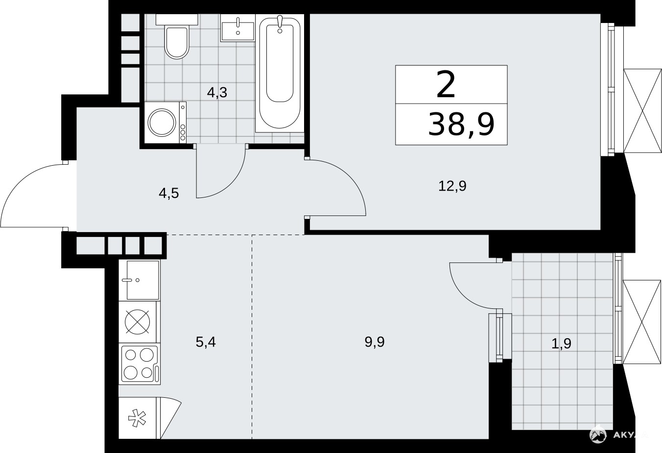 2-комн. квартира с европланировкой от застройщика в ЖК "Бунинские кварталы" на 22 этаже. Квартира без отделки, полностью готова к ремонту. Общая площадь: 38.9 кв.м., жилая: 22.8 кв.м., суммарная площадь гостиной-столовой с кухонной зоной: 15.3 кв.м. Европланировка, кухня-гостиная - идеальный вариант для тех, кто любит часто принимать гостей. Комнаты изолированные, все окна выходят на одну сторону. В квартире одна лоджия, один совмещенный санузел. Высота потолков 2.95 м.