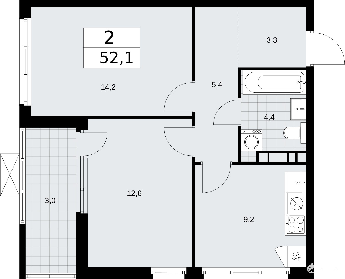 Продается двухкомнатная квартира в ЖК "Бунинские кварталы" на 18 этаже. Квартира без отделки, полностью готова к чистовой отделке и дальнейшему ремонту. Общая площадь: 52.1 кв.м., жилая: 26.8 кв.м., площадь просторной кухни-столовой: 9.2 кв.м. Угловая квартира, очень светлая, естественная вентиляция при открытии окон. В квартире одна лоджия, один совмещенный санузел. Высота потолков 2.85 м.