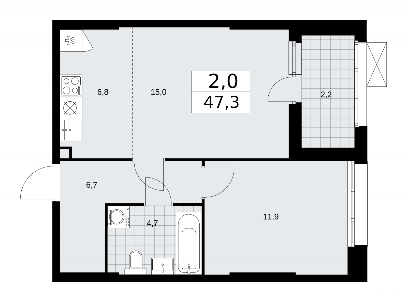 Двухкомнатная квартира бизнес-класса с европланировкой от застройщика в ЖК "Бунинские кварталы" на 14 этаже. Квартира без отделки, после оформления собственности можно делать ремонт. Общая площадь: 47.3 кв.м., жилая: 26.9 кв.м., суммарная площадь гостиной-столовой с кухонной зоной: 21.8 кв.м. Европланировка, кухня-гостиная - идеальный вариант для тех, кто любит часто принимать гостей. Комнаты изолированные, все окна выходят на одну сторону. В квартире одна лоджия, один совмещенный санузел. Высота потолков 3.1 м.