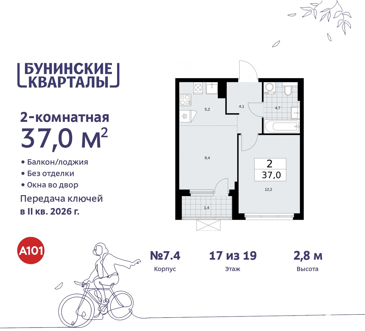 Двухкомнатная квартира в ЖК "Бунинские кварталы" на 17 этаже. Квартира без отделки, после оформления собственности можно делать ремонт. Общая площадь: 36.8 кв.м. Высота потолков 2.8 м.