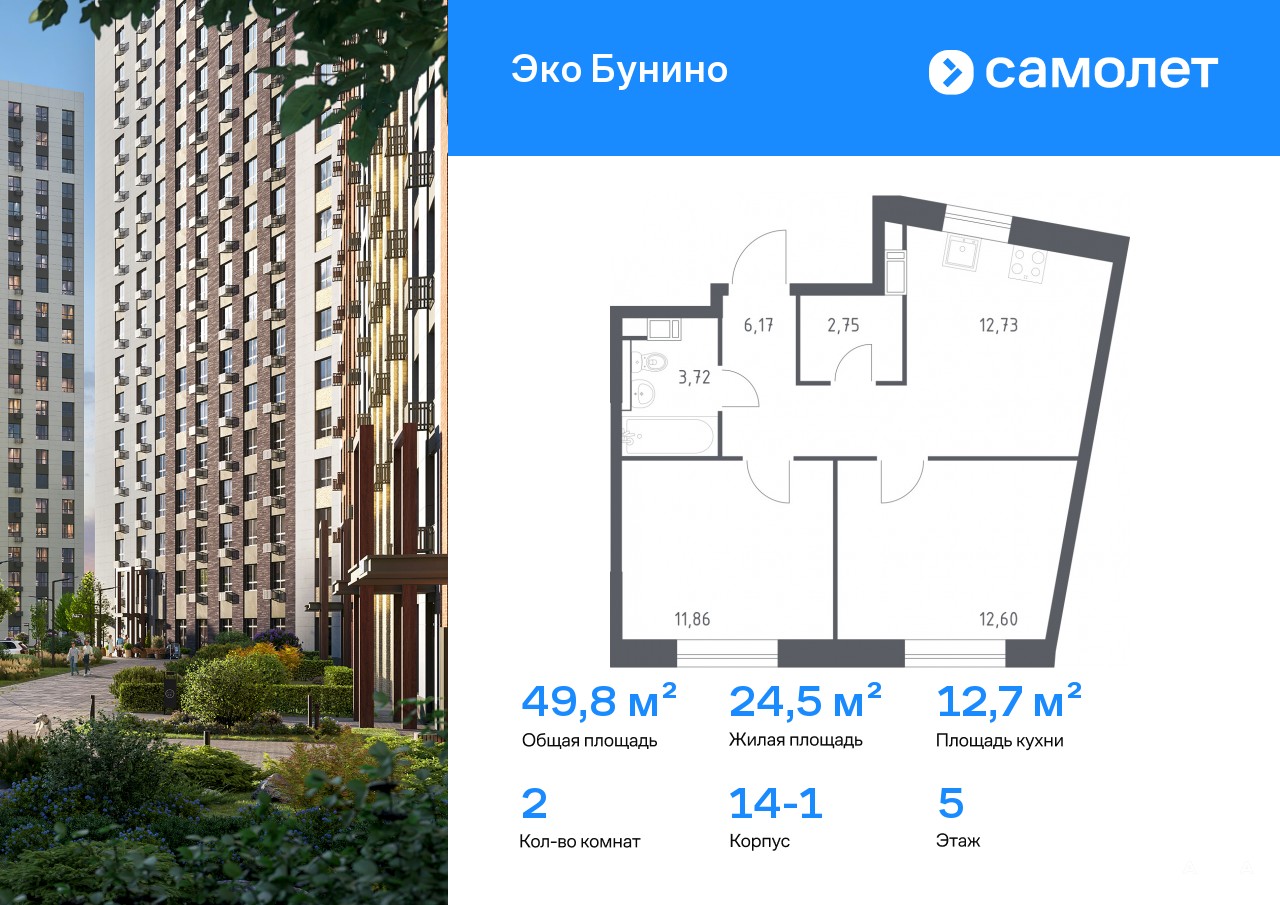 Строим кварталы для жизни с заботой о будущем. Предлагается 2-комнатная квартира комфорт-класса 49, 83 кв.м в корпусе 14-1 на 5 этаже, в ЖК «Эко Бунино»