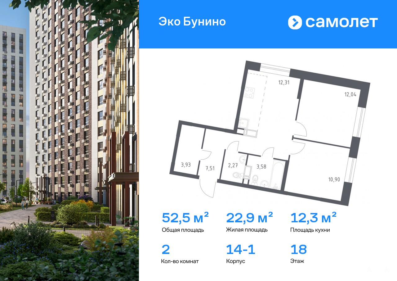 Строим кварталы для жизни с заботой о будущем. Предлагается 2-комнатная квартира комфорт-класса 52, 54 кв.м в корпусе 14-1 на 18 этаже, в ЖК «Эко Бунино»