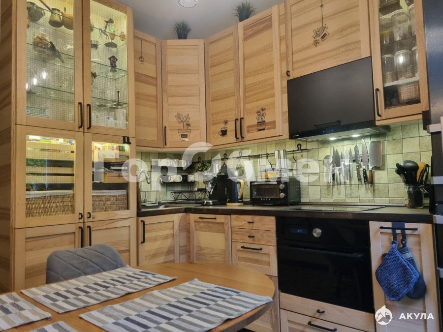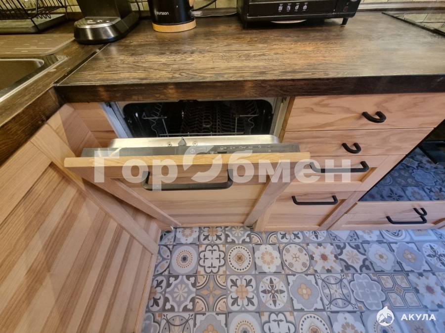 Кухонный гарнитур из натурального ясеня, оборудован встроенной техникой: посудомоечная машина, духовой шкаф с функцией МКВ печи, вытяжка, фильтр для воды. Столешница из натурального бука.