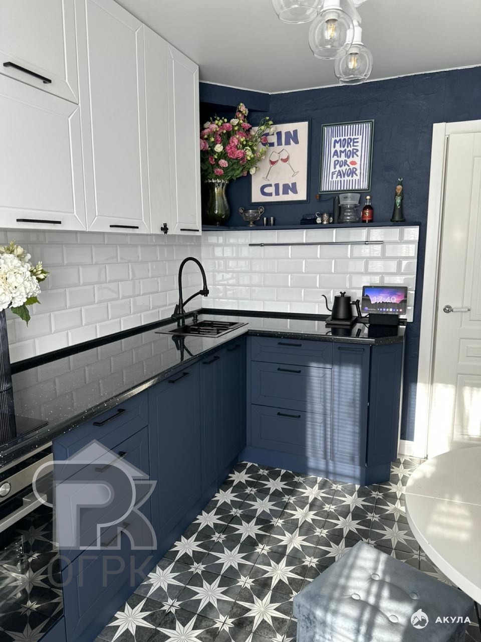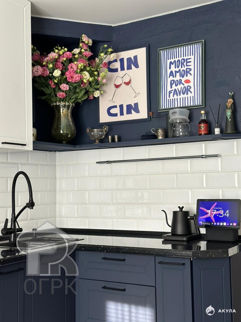 Кухня оснащена всей необходимой бытовой техникой: кондиционер, пмм машина 45см, холодильник, духовой шкаф с тройным закаленным стеклом и всевозможными функциями запекания -60см, индукционная плита (под нее выведена отдельная розетка)-60 см, вытяжка-60см, система очистки воды. Пол керамогранит с подогревом. Затирка на фартуке также эпоксидная.