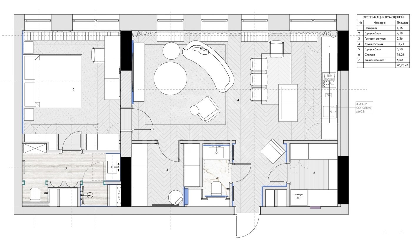 Планировочное решение предусматривает входную зону с системами хранения, гостевой санузел-постирочную, кладовая, кухню-гостиную, спальню, ванную при спальне, просторную гардеробную.